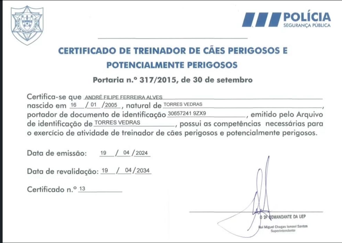 André Alves, treinador de cães certificado pela PSP e DGAV, com formação internacional nos mais altos padrões mundiais, incluindo o método NePoPo®  Gold Graduate e workshop com Michael Shikashio. Especializado em comportamento Canino, obediência e reabilitação de cães com problemas complexos.